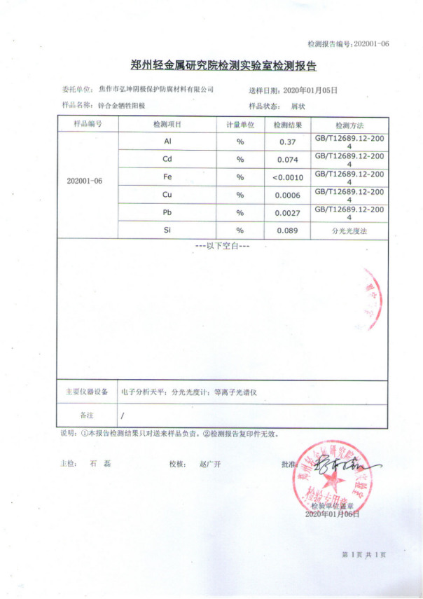 鋅合金犧牲陽極檢驗報告Ⅱ
